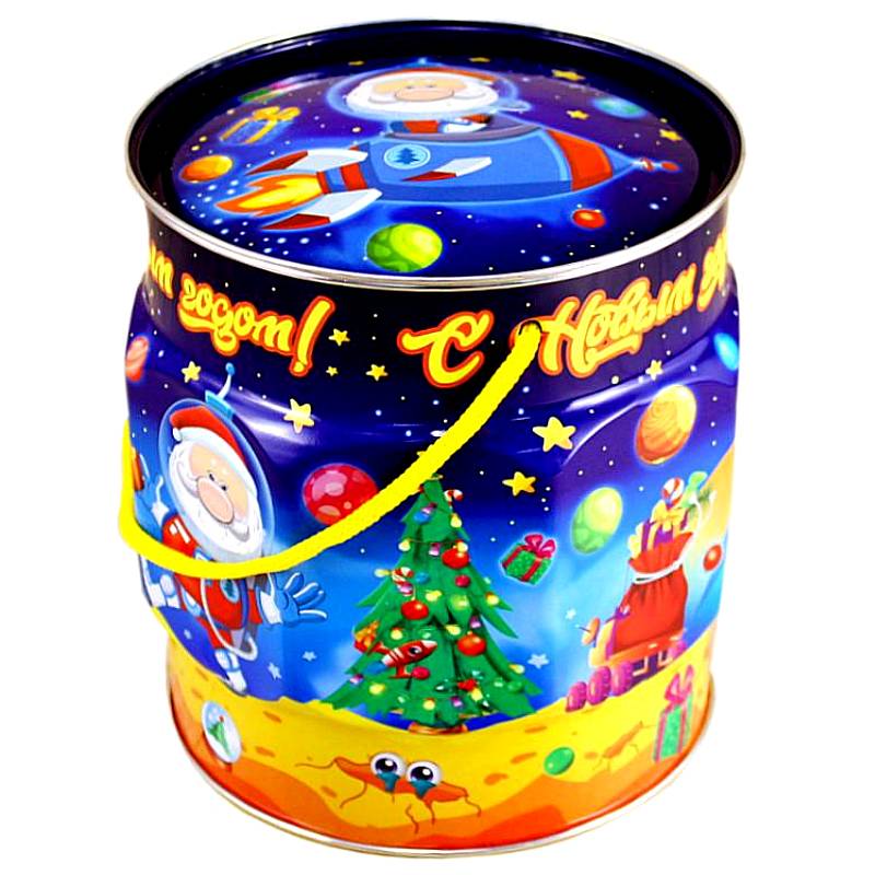 Детский новогодний подарок в жестяной упаковке весом 1200 грамм